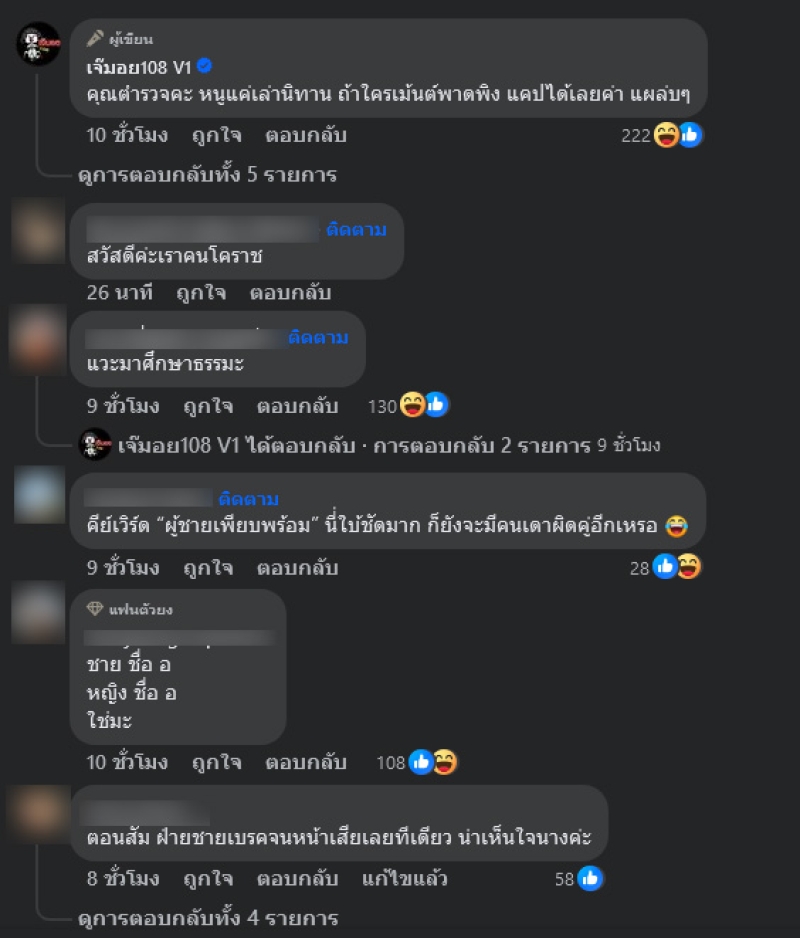 งานนี้ทำเอาลูกเพจหลายคนหย่อนคำใบ้ได้ชัดมาก อาทิ คีย์เวิร์ด ผู้ชายเพียบพร้อม นี่่ใบ้ชัดมาก ก็ยังจะมีคนเดาผิดคู่อีกเหรอ,ชาย ชื่อ อ หญิง ชื่อ อ ใช่มะ,ตอนสัม ฝ่ายชายเบรคจนหน้าเสียเลยทีเดียว น่าเห็นใจนางค่ะ,ถ้ายังไม่แต่งยังช้ำขนาดนี้ แต่งไปก็เป็นซึมเศร้าอ่ะ หาใหม่เหอะหน้าตาสวยน่ารักขนาดนั้น เป็นต้น