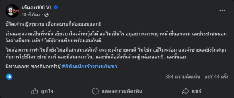 เรียกได้ว่าเป็นอีกเรื่องของคู่รักวงการบันเทิงเมื่อเพจ เจ๊มอย108 V1 ได้เล่านิทานเรื่องใหม่ที่หลายคนอ่านปุ๊บเดาออกเลยทันทีว่าเป็นใคร??กับชีวิตของเจ้าหญิงวุ่นวาย เลือกสบายก็ต้องยอมแลก!! เงินและความเป็นที่หนึ่งเยียวยาใจเจ้าหญิงได้ แต่ไม่เป็นไรอยู่อย่างนางพญาหน้าชื่นอกตรม แต่ประชาชนนอกวังต่างชื่นชม เห้ย!! ได้ผู้ชายเพียบพร้อมสมกันดี