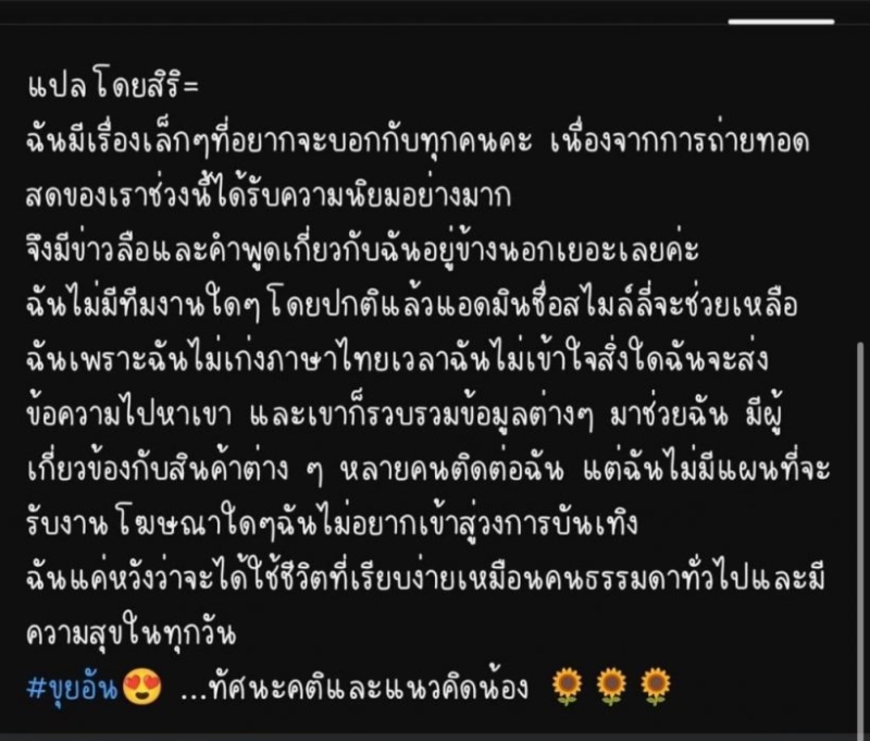แต่ล่าสุดดูเหมือนว่าชาวด้อมอาจจะต้องใช้แรงจิ้นให้หนักกว่าเดิมอีกเลเวล เพราะเจ้าตัวออกมาพูดชัดเจนว่า กับหนุ่มแน็ก น่าจะลุ้นไม่ขึ้นเพราะไม่ใช่ผู้ชายประเภทที่เธอชอบ รวมทั้งเธออยากเป็นคนธรรมดาแบบนี้มากกว่าเป็นเซเลบที่แสงจับจ้อง อยากใช้ชีวิตเรียบง่าย ไม่อยากเข้าสู่วงการบันเทิง เพราะทำตัวไม่ถูก