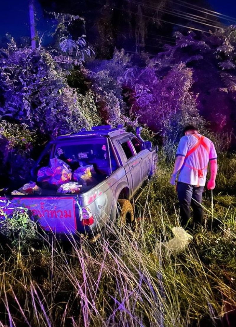 รถกระบะผมที่เพิ่งซื้อมาเป็นรถ offroad ยกสูง ล้อใหญ่ บวกกับด้วยบรรทุกของหนัก นม น้ำ อาหารสัตว์ ถุงยังชีพ ทำให้รถมีน้ำหนักเยอะเกินไป ระหว่างเข้า อ.โพนพิสัย พวงมาลัยสะบัด รถเกิดอุบัติเหตุ เสียหลักลงข้างทางครับ