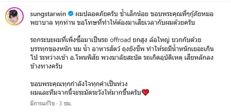 ล่าสุด ทางซุงได้ออกมาอัปเดตอาการผ่านทางอินสตาแกรม พร้อมระบุข้อความว่า ผมปลอดภัยครับ ช้ำเล็กน้อย ขอบพระคุณพี่ๆกู้ภัยหมอ พยาบาล ทุกท่าน ขอโทษที่ทำให้ต้องมาเสียเวลากับผมด้วยครับ