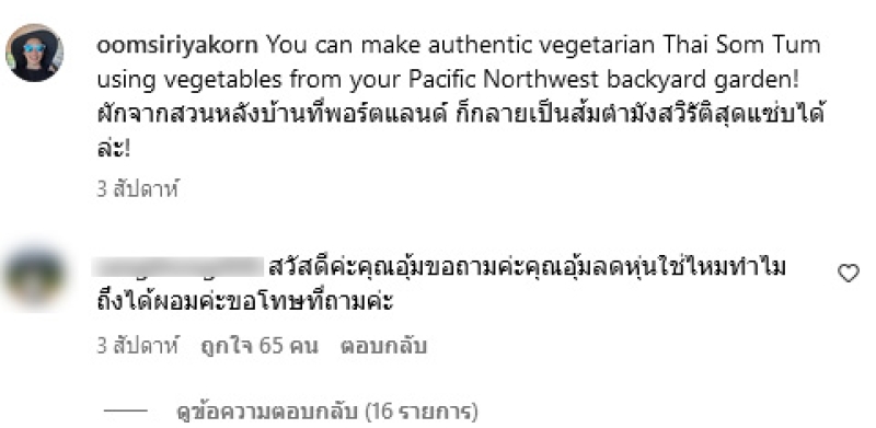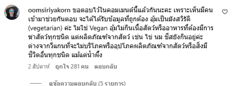ทั้งนี้ทางด้าน อุ้ม ก็ได้เข้ามาตอบกลับทันทีว่า ขอตอบไว้ในคอมเมนต์นี้แล้วกันนะคะ เพราะเห็นมีคนเข้ามาช่วยกันตอบ จะได้ได้รับข้อมูลที่ถูกต้อง อุ้มเป็นมังสวิรัติ (vegetarian) ค่ะ ไม่ใช่ Vegan อุ้มไม่กินเนื้อสัตว์หรืออาหารทึ่ต้องมีการฆ่าสัตว์ทุกชนิด แต่ผลิตภัณฑ์จากสัตว์ เช่น ไข่ นม ชีสยังกินอยู่ค่ะ ต่างจากวีแกนที่จะไม่บริโภคหรืออุปโภคผลิตภัณฑ์จากสัตว์หรือสิ่งมีชีวิตอื่นทุกชนิด แม้แต่น้ำผึ้ง