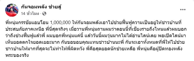 เรียกได้ว่า ช่วงนี้ในของประเทศไทยได้รับผลกระทบจากน้ำท่วมหนักในรอบหลายปี ทำให้มีชาวบ้านเดือดร้อนเป็นจำนวนมาก และก็มีดาราคนดังหลายคนที่ออกมาบริจาคช่วยน้ำท่วมด้วย โดยล่าสุดทาง กันจอมพลัง ช่วยสู้ ได้ออกมาโพสต์ พี่หนุ่มกรรชัยแอบโอน 1,000,000 ให้กันจอมพลังเอาไปช่วยฟื้นฟูความเป็นอยู่ให้ชาวบ้านที่ประสบภัยภาคเหนือ พี่นี่สุดจริงๆ เมื่อวานพี่หนุ่มถามผมว่าตอนนี้ที่เชียงรายถึงไหนแล้วผมบอกว่าถึงช่วงฟื้นฟูแล้วพี่ ผมบอกพี่หนุ่มแค่นี้ แล้ววันนี้ผมวุ่นมากไม่ได้อ่านไลน์เลย พอเปิดไลน์มาเห็นยอดตกใจยอดเยอะมาก กันขอขอบคุณแทนชาวบ้านนะพี่ กันจะเอาทั้งหมดที่พี่ให้ไปช่วยชาวบ้านให้มากที่สุดจะไม่ทำให้พี่ผิดหวัง พี่คือสุดยอดนักช่วยเหลือ พี่หนุ่มคือผู้ปิดทองหลังพระของจริง