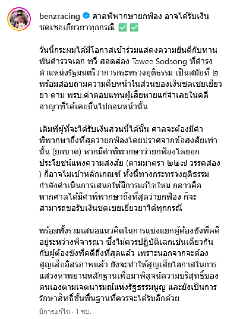 ล่าสุด เบนซ์ ได้ออกมาอัปเดตถึงเรื่องคดีว่า ศาลพิพากษายกฟ้อง อาจได้รับเงินชดเชยเยียวยาทุกกรณี วันนี้กระผมได้มีโอกาสเข้าร่วมแสดงความยินดีกับท่าน พันตำรวจเอก ทวี สอดส่อง Tawee Sodsong ที่ดำรงตำแหน่งรัฐมนตรีว่าการกระทรวงยุติธรรม เป็นสมัยที่ ๒ พร้อมสอบถามความคืบหน้าในส่วนของเงินชดเชยเยียวยา ตาม พ.ร.บ. ค่าตอบแทนผู้เสียหายแก่จำเลยในคดีอาญาที่ได้เคยยื่นไปก่อนหน้านั้น