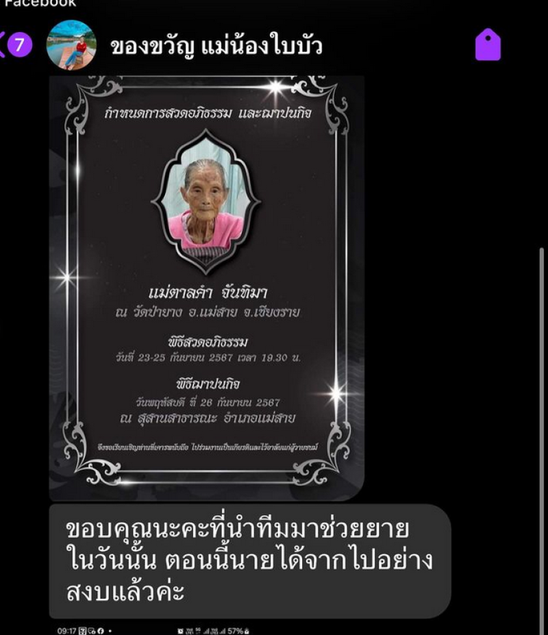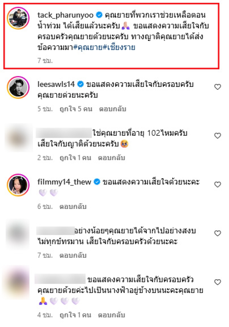 แต่ล่าสุด แทค ภรัณยู ได้รับเเจ้งว่า แม่เฒ่าอายุ 102 ปี ได้เสียชีวิตเเล้วโดยเขียนว่า คุณยายที่พวกเราช่วยเหลือตอนน้ำท่วม ได้เสียแล้วนะครับ ขอแสดงความเสียใจกับครอบครัวคุณยายด้วยนะครับ ทางญาติคุณยายได้ส่งข้อความมา#คุณยาย#เชียงราย ท่ามกลางแฟนๆและคนในวงการเข้ามาคอมเมนต์แสดงความเสียอย่างมาก