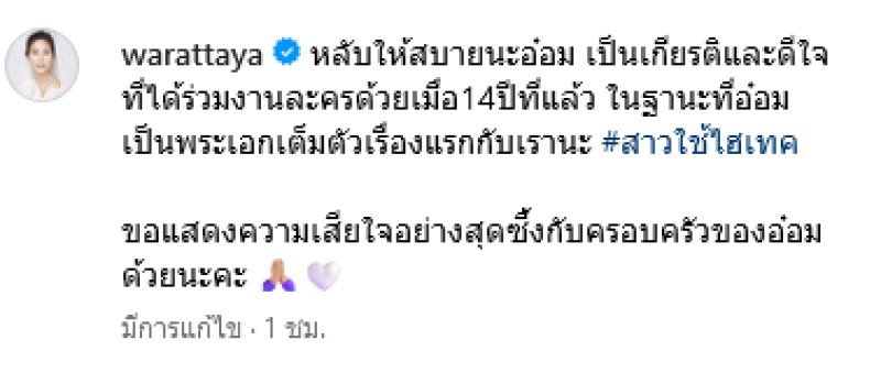 ทางด้าน จุ๋ย วรัทยา นิลคูหา อดีตนางเอกช่อง7ได้โพสต์ภาพคู่ อ๋อม จากในละครเรื่อง สาวใช้ไฮเทค พร้อมเขียนข้อความอาลัยว่า หลับให้สบายนะอ๋อม เป็นเกียรติที่ได้ร่วมงานละครด้วยเมื่อ 14 ปีที่แล้ว ในฐานะที่อ๋อมเป็นพระเอกเต็มตัวเรื่องแรกกับเรานะ #สาวใช้ไฮเทค ขอแสดงความเสียใจอย่างสุดซึ้งกับครอบครัวของอ๋อมด้วยนะคะ