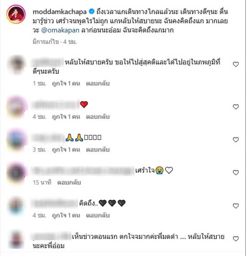 โดยทาง มดดำ คชาภา ได้โพสต์อาลัยรักถึงอ๋อมว่า ถึงเวลาแกเดินทางไกลแล้วนะ เดินทางดีๆนะ ตื่นมารู้ข่าว เศร้าจนพูดไรไม่ฤูก แกหลับให้สบายนะ ฉันคงคิดถึงแก มากเลยวะ @omakapan ลาก่อนนะอ๋อม ฉันจะคิดถึงแกมาก