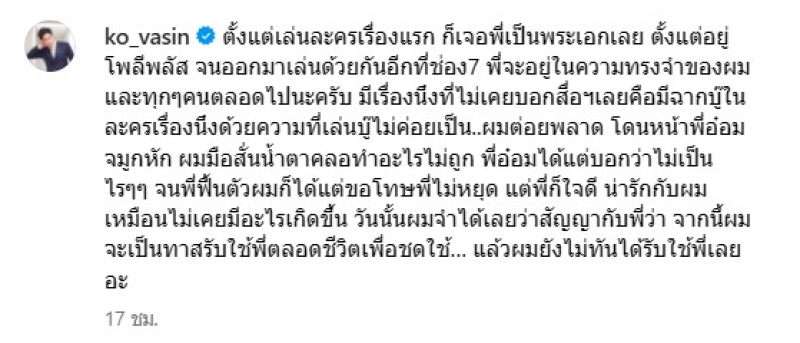 ล่าสุด โก้ วศิน เพื่อนอีกคนของหนุ่มอ๋อม ได้ออกมาเผยอีกมุม ที่สื่อก็ยังไม่เคยรู้มาก่อนกับเหตุการณ์ที่เกิดขึ้นในกองละคร โก้เล่าว่า ตั้งแต่เล่นละครเรื่องแรก ก็เจอพี่เป็นพระเอกเลย ตั้งแต่อยู่โพลีพลัส จนออกมาเล่นด้วยกันอีกที่ช่อง7 พี่จะอยู่ในความทรงจำของผมและทุกๆคนตลอดไปนะครับ
