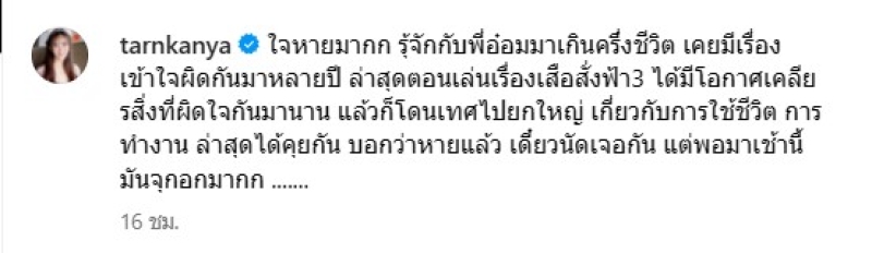 ล่าสุด ดาราสาวอีกคน อย่าง ตาล กัญญา ก็ออกมาโพสต์อาลัย พร้อมเผยเรื่องที่เคยผิดใจกัน โดยได้เผยว่า ใจหายมากก รุ้จักกับพี่อ๋อมมาเกินครึ่งชีวิต เคยมีเรื่องเข้าใจผิดกันมาหลายปี ล่าสุดตอนเล่นเรื่องเสือสั่งฟ้า3 ได้มีโอกาศเคลียรสิ่งที่ผิดใจกันมานาน แล้วก็โดนเทศไปยกใหญ่ เกี่ยวกับการใช้ชีวิต การทำงาน ล่าสุดได้คุยกัน บอกว่าหายแล้ว เดี๋ยวนัดเจอกัน แต่พอมาเช้านี้ มันจุกอกมากก