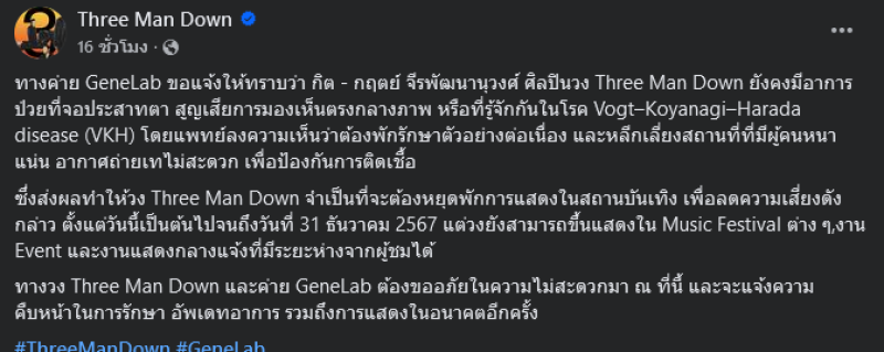 ซึ่งส่งผลทำให้วง Three Man Down จำเป็นที่จะต้องหยุดพักการแสดงในสถานบันเทิง เพื่อลดความเสี่ยงดังกล่าว ตั้งแต่วันนี้เป็นต้นไปจนถึงวันที่ 31 ธันวาคม 2567 แต่วงยังสามารถขึ้นแสดงใน Music Festival ต่าง ๆ,งาน Event และงานแสดงกลางแจ้งที่มีระยะห่างจากผู้ชมได้ ทางวง Three Man Down และค่าย GeneLab ต้องขออภัยในความไม่สะดวกมา ณ ที่นี้ และจะแจ้งความคืบหน้าในการรักษา อัพเดทอาการ รวมถึงการแสดงในอนาคตอีกครั้ง