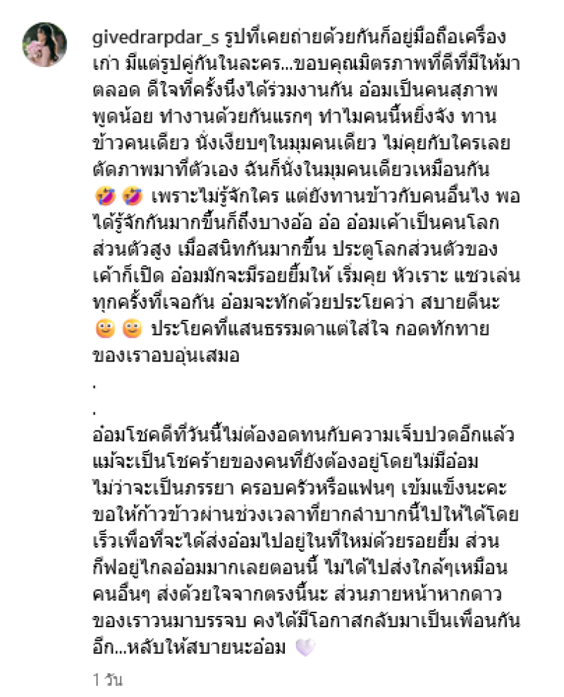 ล่าสุด กีฟ ดราภดา ได้เผยว่า ไม่สะดวกไปร่วมงานเพราะอยู่ต่างประเทศ โดยโพสต์อาลัย พร้อมบอกว่า "ส่วนกีฟอยู่ไกลอ๋อมมากเลยตอนนี้ ไม่ได้ไปส่งใกล้ๆเหมือนคนอื่นๆ ส่งด้วยใจจากตรงนี้นะ