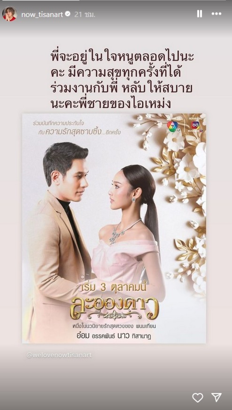 เรียกได้ว่าเป็นอีกหนึ่งนางเอกชื่อดังสำหรับ นาว ทิสานาฎ ที่ตอนนี้ได้เรียนต่ออยู่ที่ต่างประเทศทำให้ไม่สามารถมาร่วมส่งพี่ชาย อ๋อม อรรคพันธ์ โดยหลังจากที่ได้ยืนยัดชัดเจนแล้วว่าทางช่อง7HD เตรียมส่งละคร ละอองดาว กลับมาอีกครั้งในช่วง ละครดังที่คิดถึง เพื่อร่วมระลึกถึงพระเอกผู้ล่วงลับ อ๋อม อรรคพันธ์ นะมาตร์ ที่ได้จากไปอย่างสงบในวัย 39 ปี