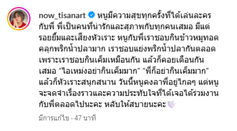 ทางด้าน นาว ทิสานาฎ นางเอกเรื่อง ละอองดาว ได้โพสต์อำลาผ่านอินสตาแกรมส่วนตัวว่า หนูมีความสุขทุกครั้งที่ได้เล่นละครกับพี่ พี่เป็นคนที่น่ารักและสุภาพกับทุกคนเสมอ มีแต่รอยยิ้มและเสียงหัวเราะ หนูกับพี่เราชอบกินข้าวหมูทอดคลุกพริกน้ำปลามาก เราชอบแย่งพริกน้ำปลากันตลอด เพราะเราชอบกินเค็มเหมือนกัน แล้วก็คอยเตือนกันเสมอ ไอเหม่งอย่ากินเค็มมาก พี่ก็อย่ากินเค็มมาก แล้วก็หัวเราะสนุกสนาน
