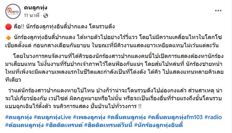 เรียกได้ว่า กำลังเปป็นประเด็นร้อน เมื่อล่าสุด เพจดัง อย่าง คนลูกทุ่ง ได้ออกมาเผยว่า นักร้องลูกทุ่งอินดี้ปากแดง ได้หายตัวไปอย่างไร้วี่แวว โดยไม่มีความเคลื่อนไหวในโลกโซเชียลตั้งแต่ ก่อนกลางเดือนกันยายน ในขณะที่มีคิวงานแสดงยาวเหยียดแทบไม่เว้นแต่ละวัน