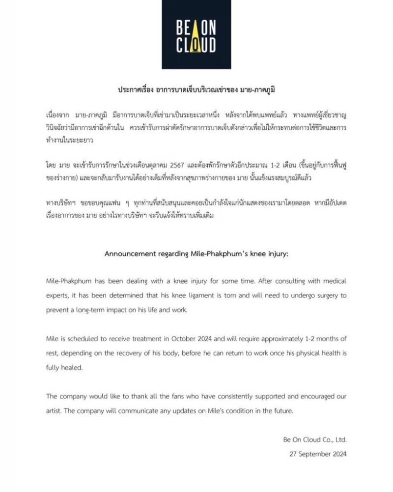 โดย มาย จะเข้ารับการรักษาในช่วงเดือนตุลาคม 2567 และต้องพักรักษาตัวอีกประมาณ 1-2 เดือน (ขึ้นอยู่กับการฟื้นฟูของร่างกาย) และจะกลับมารับงานได้อย่างเต็มที่หลังจากสุขภาพร่างกายของ มาย นั้นแข็งแรงสมบูรณ์ดีแล้ว ทางบริษัทต้องขอขอบคุณทุกท่านที่สนับสนุน และให้กำลังใจแฟนๆ มาโดยตลอด หากมีอัปเดตเรื่องอาการของ มาย อย่างไรทางบริษัทจะรีบแจ้งให้ทราบทันที