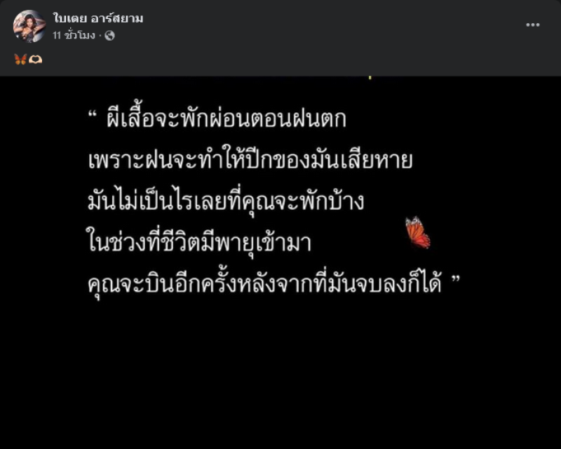 เรียกได้ว่าเป็นอีกหนึ่งนักร้องสาวแซ่บสำหรับ ใบเตย อาร์สยาม ที่ได้เจอมรสุมชีวิตมากมาย โดยล่าสุดได้แชร์ภาพที่มีข้อความ คล้ายกับให้กำลังใจตัวเอง ระบุว่า ผีเสื้อจะพักผ่อนตอนฝนตก เพราะฝนจะทำให้ปีกของมันเสียหาย มันไม่เป็นไรเลยที่คุณจะพักบ้าง ในช่วงที่ชีวิตมีพายุเข้ามา คุณจะบินอีกครั้งหลังจากที่มันจบลงก็ได้