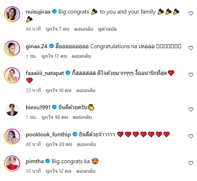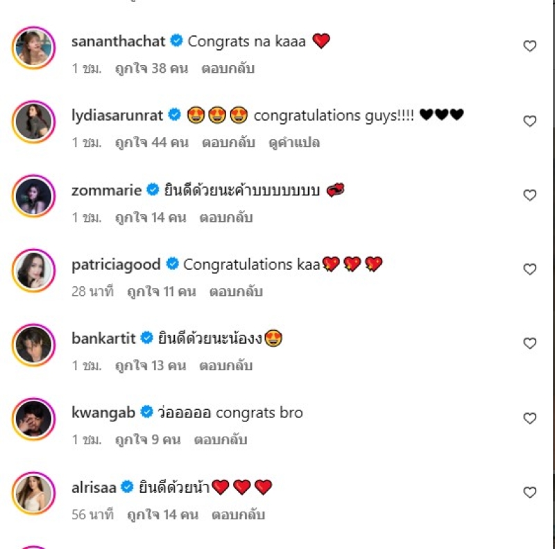 งานนี้ เหล่าเพื่อนๆในวงการบันเทิง เข้ามาแสดงความยินดีและดีใจกันจำนวนมาก ทางทีมข่าวขอแสดงความยินดีด้วยนะคะ