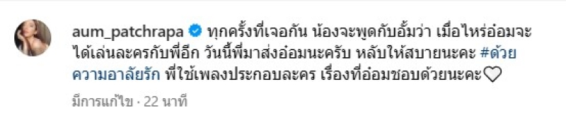 ล่าสุดทาง นางเอกดังอย่าง อั้ม พัชราภา ก็ได้โพสต์ถึงอ๋อมผ่านทางอินสตาแกรมส่วนตัว โดยได้ระบุข้อความว่า ทุกครั้งที่เจอกัน น้องจะพูดกับอั้มว่า เมื่อไหร่อ๋อมจะได้เล่นละครกับพี่อีก วันนี้พี่มาส่งอ๋อมนะครับ หลับให้สบายนะคะ #ด้วยความอาลัยรัก พี่ใช้เพลงประกอบละคร เรื่องที่อ๋อมชอบด้วยนะคะ