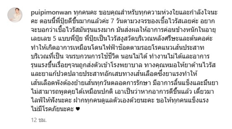 เรียกได้ว่า เป็นดารา-พิธีกรชื่อดัง อย่าง ปุ้ย พิมลวรรณ ที่ล่าสุดได้โพสต์รูปตัวเองเข้าโรงพยาบาล พร้อมเผยอาการว่า ทุกคนคะ ขอบคุณสำหรับทุกความห่วงใยและกำลังใจนะคะ ตอนนี้พี่ปุ้ยดีขึ้นมากแล้วค่ะ 7 วันตามวงจรของเชื้อไวรัสเลยค่ะ อยากจะบอกว่าเชื้อไวรัสมันรุนแรงมาก มันส่งผลให้อาการค่อนข้างหนักในอายุเลยเลข 5 แบบพี่ปุ้ย พี่ปุ้ยเป็นไวรัสงูสวัดบริเวณหลังศรีษะและต้นคอค่ะ ทำให้เกิดอาการเหมือนโดนไฟฟ้าช๊อตตามรอยโรคแนวเส้นประสาทบริเวณที่เป็น จนรบกวนการใช้ชีวิต นอนไม่ได้ ทำงานไม่ได้และอาการรุนแรงขึ้นเรื่อยๆจนถูกส่งตัวเข้าโรงพยาบาล ทางคุณหมอให้ยาต้านไวรัสและยาแก้ปวดปลายประสาทอักเสบทางเส้นเลือดซึ่งยาแรงทำให้เส้นเลือดพังต้องย้ายเส้นทุกวันตลอดการรักษา มีอาการลิ้นแข็งและมึนยาไม่สามารถพูดคุยได้เหมือนปกติ เอาเป็นว่าหากอาการดีขึ้นแล้ว เดี๋ยวมาไลฟ์ให้ฟังนะคะ ฝากทุกคนดูแลตัวเองด้วยนะคะ ขอให้ทุกคนแข็งแรง ไม่มีโรคภัยนะคะ