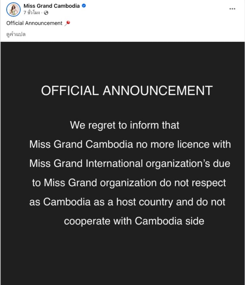 โดยได้ระบุข้อความว่า ประกาศอย่างเป็นทางการ เราเสียใจที่ต้องแจ้งให้ทราบว่ากัมพูชาจะไม่ทำหน้าที่เป็นประเทศเจ้าภาพของเราอีกต่อไป เนื่องจากองค์กรเจ้าภาพไม่สามารถปฏิบัติตามข้อกำหนดตามที่กำหนดไว้ในสัญญาข้อตกลงเจ้าภาพ น่าเสียดายที่พวกเขาไม่สามารถให้บริการที่ตรงตามมาตรฐานขององค์กร Miss Grand International (MGI) ได้