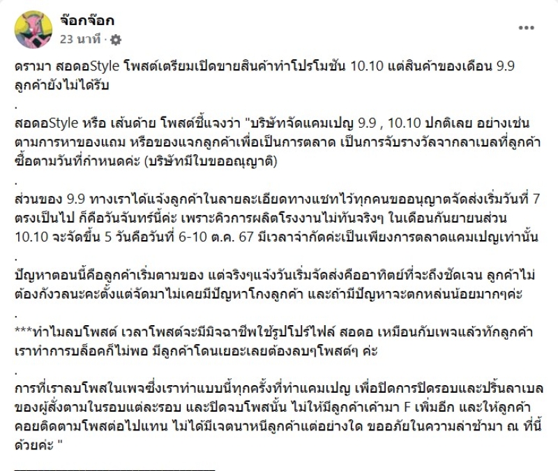 เรียกได้ว่า เป็นดรามาอีกแล้ว เมื่อเพจดัง อย่าง จ๊อกจ๊อก ได้ออกมาเปิดประเด็นว่า ดรามา สอดอStyle โพสต์เตรียมเปิดขายสินค้าทำโปรโมชัน 10.10 แต่สินค้าของเดือน 9.9 ลูกค้ายังไม่ได้รับ