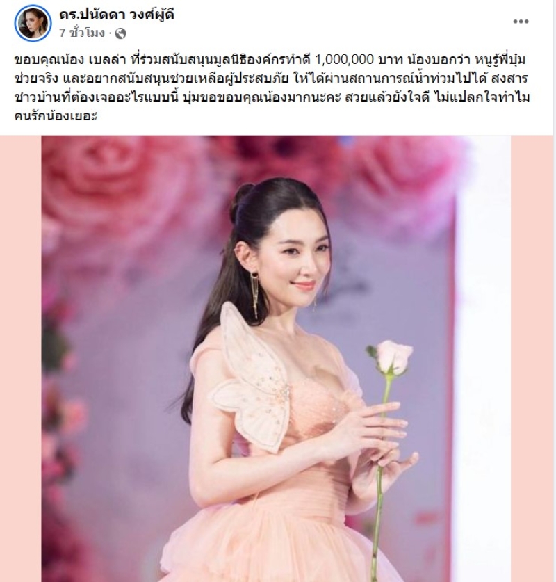 เรียกได้ว่า เป็นนางเอกอีกคนที่ใจบุญสุดๆ อย่าง เบลล่า ราณี ที่หลายๆคนรู้อยู่แล้วว่าชอบทำบุญมากๆ ล่าสุดทาง บุ๋ม ได้โพสต์ผ่านเพจ ดร.ปนัดดา วงศ์ผู้ดี โดยได้ระบุข้อความว่า ขอบคุณน้อง เบลล่า ที่ร่วมสนับสนุนมูลนิธิองค์กรทำดี 1,000,000 บาท น้องบอกว่า หนูรู้พี่บุ๋มช่วยจริง และอยากสนับสนุนช่วยเหลือผู้ประสบภัย ให้ได้ผ่านสถานการณ์น้ำท่วมไปได้ สงสารชาวบ้านที่ต้องเจออะไรแบบนี้ บุ๋มขอขอบคุณน้องมากนะคะ สวยแล้วยังใจดี ไม่แปลกใจทำไมคนรักน้องเยอะ