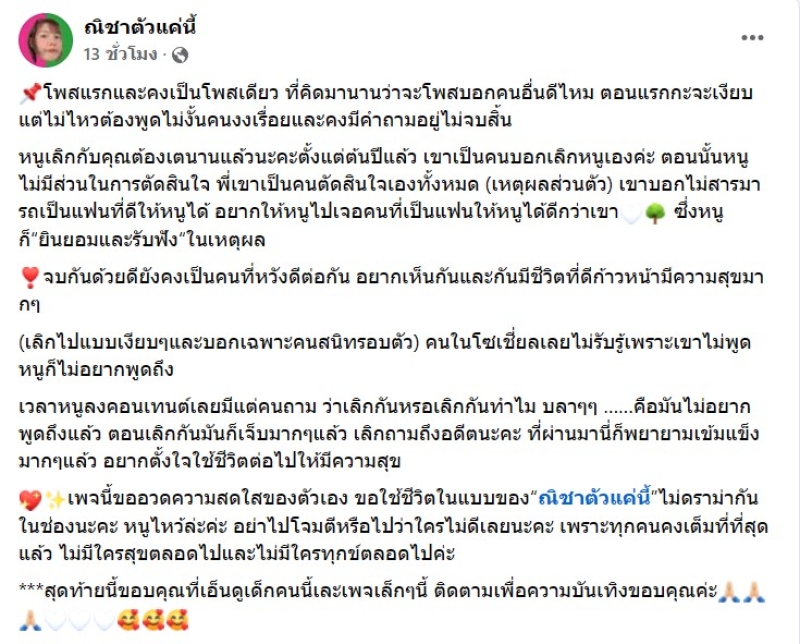 เวลาหนูลงคอนเทนต์เลยมีแต่คนถาม ว่าเลิกกันหรอเลิกกันทำไม บลาๆๆ ……คือมันไม่อยากพูดถึงแล้ว ตอนเลิกกันมันก็เจ็บมากๆแล้ว เลิกถามถึงอดีตนะคะ ที่ผ่านมานี่ก็พยายามเข้มแข็งมากๆแล้ว อยากตั้งใจใช้ชีวิตต่อไปให้มีความสุข