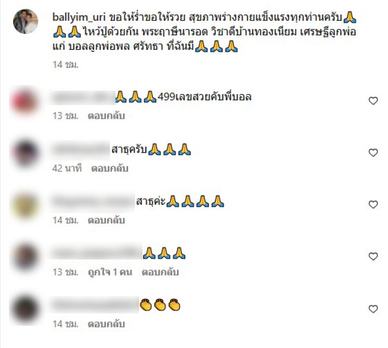 โดยได้มีชาวเน็ตเข้ามาคอมเมนต์เพียบ เช่น 499เลขสวยคับพี่บอล,สาธุสาธุสาธุค่ะ,สา ทุๆๆ เลขไรพี่บอล,น้อมกราบสาธุค่ะ เป็นต้น