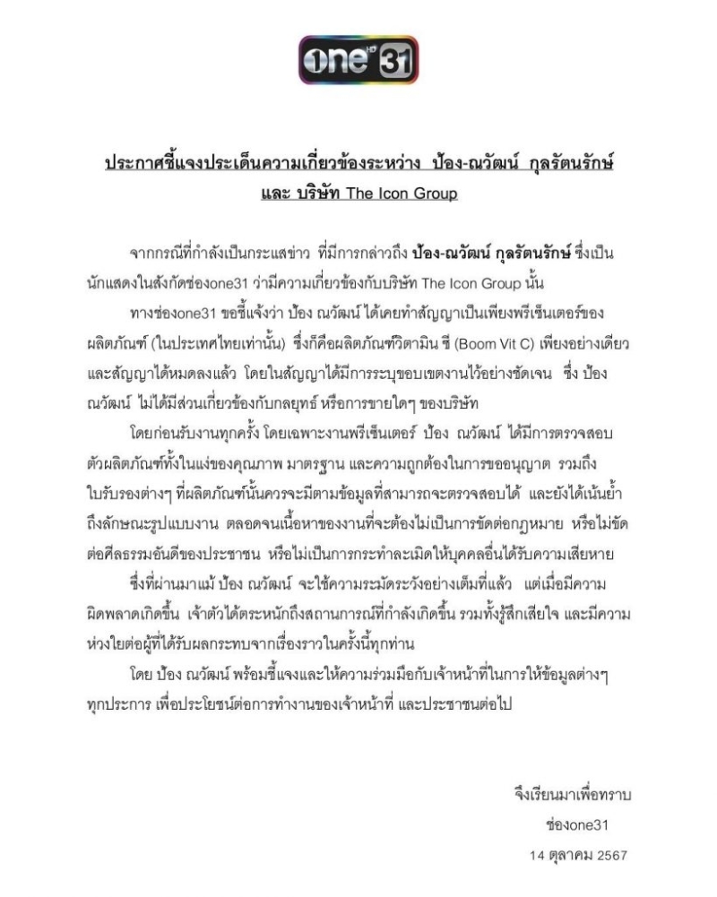 จากกรณีที่กำลังเป็นกระแสข่าว ที่มีการกล่าวถึง ป้อง ณวัฒน์ กุลรัตนรักษ์ ซึ่งเป็นนักแสดงในสังกัดช่องone31 ว่ามีความเกี่ยวข้องกับบริษัท The Icon Group นั้นทางช่องone31 ขอชี้แจ้งว่า ป้อง ณวัฒน์ ได้เคยทำสัญญาเป็นเพียงพรีเซ็นเตอร์ของผลิตภัณฑ์ (ในประเทศไทยเท่านั้น) ซึ่งก็คือผลิตภัณฑ์วิตามิน ซี (Boom Vit C) เพียงอย่างเดียวและสัญญาได้หมดลงแล้ว