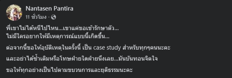 พี่เขาไม่ได้หนีไปไหน...เขาแค่ขอเข้ารักษาตัว... ไม่มีใครอยากให้มีเหตุการณ์แบบนี้เกิดขึ้น... ต่อจากนี้ขอให้อุบัติเหตุในครั้งนี้ เป็น case study สำหรับทุกๆคนนะคะและอย่าได้ซ้ำเติมหรือโทษฝ่ายใดฝ่ายนึงเลย...มันบันทอนจิตใจขอให้ทุกอย่างเป็นไปตามขบวนการและยุติธรรมนะคะ