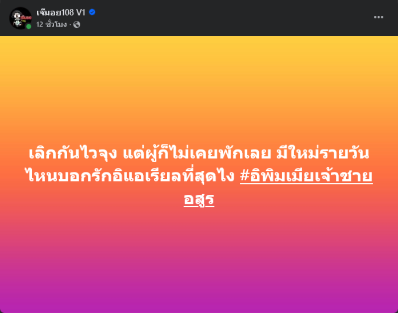 เรียกได้ว่ามีเรื่องราวให้ชวเน็ตได้ตามสืบกันอีกแล้วเมื่อทางด้นเพจ เจ๊มอย108 ได้โพสต์ถึงคู่รักคู่หนึ่งเลิกกันแล้ว แถมฝ่ายชายก็มูฟออนเร้วเร็ว โดยได้เขียนโพสต์ไว้ว่า