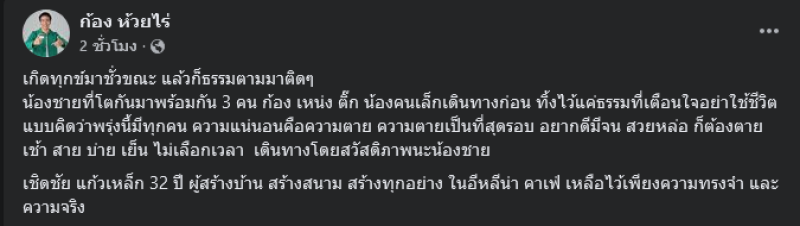 เกิดทุกข์มาชั่วขณะ แล้วก็ธรรมตามมาติดๆ น้องชายที่โตกันมาพร้อมกัน 3 คน ก้อง เหน่ง ติ๊ก น้องคนเล็กเดินทางก่อน ทิ้งไว้แค่ธรรมที่เตือนใจอย่าใช้ชีวิตแบบคิดว่าพรุ่งนี้มีทุกคน ความแน่นอนคือความตาย ความตายเป็นที่สุดรอบ อยากดีมีจน สวยหล่อ ก็ต้องตาย เช้า สาย บ่าย เย็น ไม่เลือกเวลา เดินทางโดยสวัสดิภาพนะน้องชาย เชิดชัย แก้วเหล็ก 32 ปี ผู้สร้างบ้าน สร้างสนาม สร้างทุกอย่าง ในอีหลีน่า คาเฟ่ เหลือไว้เพียงความทรงจำ และความจริง