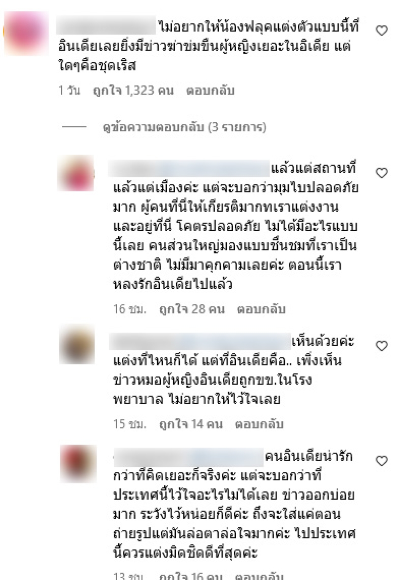 ซึ่งภาพที่ได้ลงในอินสตาแกรมส่วนตัวนั้นจะเห็นว่ามีผู้ชายอินเดียมองตามเเบบไม่ละสายตา ท่ามกลางแฟนๆเข้ามาคอมเมนต์ถึงการเเต่งตัวกันอย่างมาก อาทิ ไม่อยากให้น้องฟลุคแต่งตัวแบบนี้ที่อินเดียเลยยิ่งมีข่าวฆ่าข่มขืนผู้หญิงเยอะในอิเดีย แต่ใดๆคือชุดเริส,ยอมในความกล้า กล้าแบบมากๆ เสียวโดนลากมาก อีคนประเทศนี้ยิ่งล่มขุ่มลืนขื่นเก่งๆอยู่,ปกติชอบความมั่นใจของฟลุ๊คนะ แต่อันนี้ไม่เหมาะสมอะ เป็นต้น