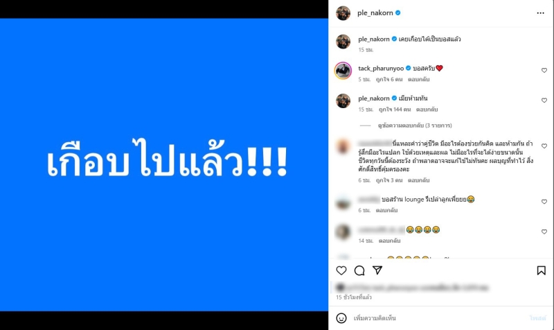 เรียกได้ว่า ช่วงนี้กระแสของ บอส กำลังมาแรงมาก และเป็นที่สนใจของเหล่าชาวเน็ตกันเป็นจำนวนมาก และล่าสุด เปิ้ล นาคร ได้ออกมาโพสต์ว่า ผ่านอินสตราแกรม @ple_nakorn บอกว่า เกือบไปแล้ว นอกจากนั้น ยังมีแคปชั่นเพิ่มเติมบอกว่า เคยเกือบได้เป็นบอสแล้ว และ เมียห้ามทัน