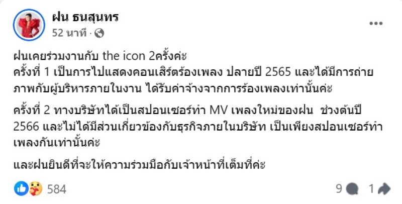 เรียกได้ว่า เป็นประเด็นที่กำลังสะเทือนวงการบันเทิงสุดๆ เพราะมีเหล่าดาราคนดัง นักร้องที่เคยเกี่ยวข้องกับ บริษัท The iCon Group และหลายๆคนเองก็ออกมาชี้แจงแล้ว ว่าส่วนที่เกี่ยวข้องนั้นแค่เรื่องงานและถูกจ้างเฉยๆนั่นเอง และหนึ่งในนั้น ก็คือ นักร้องลูกทุ่งสาว อย่าง ฝน ธนสุนทร