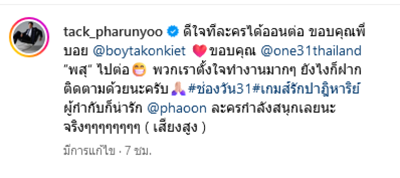 ล่าสุดทางด้าน แทค ภรัณยู ได้ออกมาโพสต์ผ่านอินสตาแกรมส่วนตัวว่า ดีใจที่ละครได้ออนต่อ ขอบคุณพี่บอย ขอบคุณ พสุ ไปต่อพวกเราตั้งใจทำงานมากๆ ยังไงก็ฝากติดตามด้วยนะครับ #ช่องวัน31 #เกมรักปาฏิหาริย์ ผู้กำกับก็น่ารัก ละครกำลังสนุกเลยนะ จริงๆๆๆๆๆๆๆๆ ( เสียงสูง )