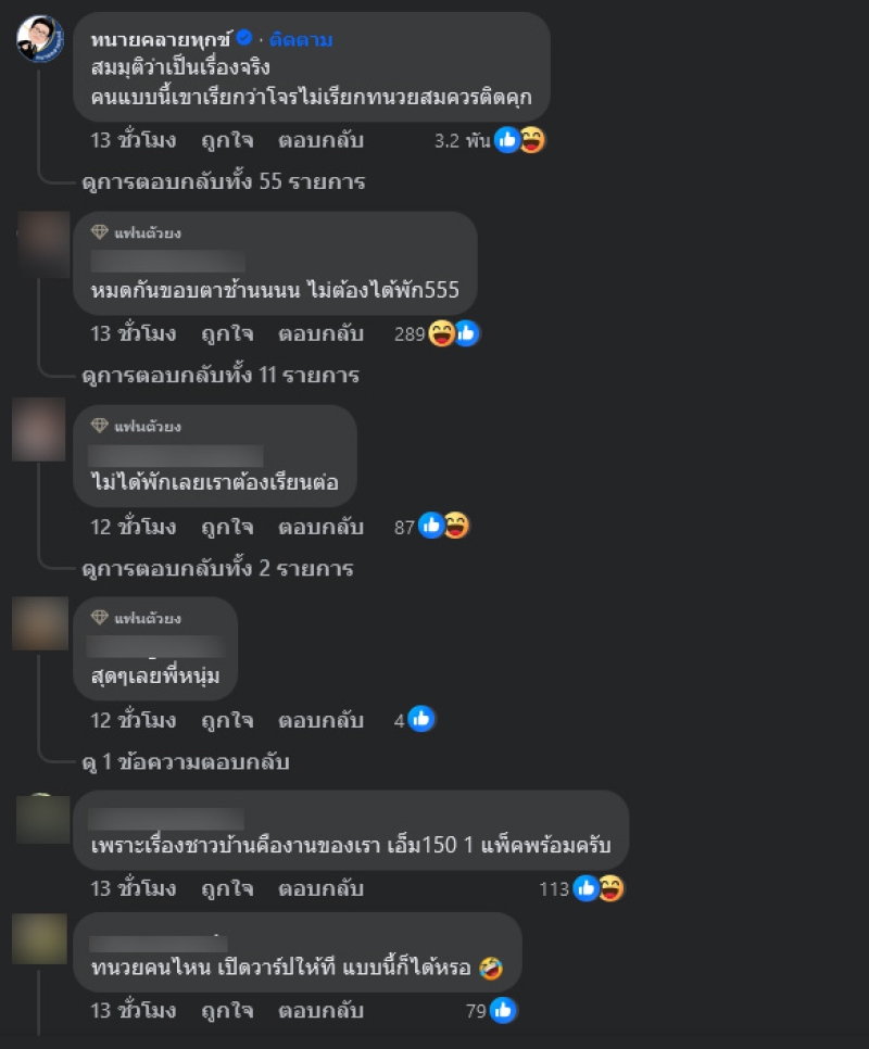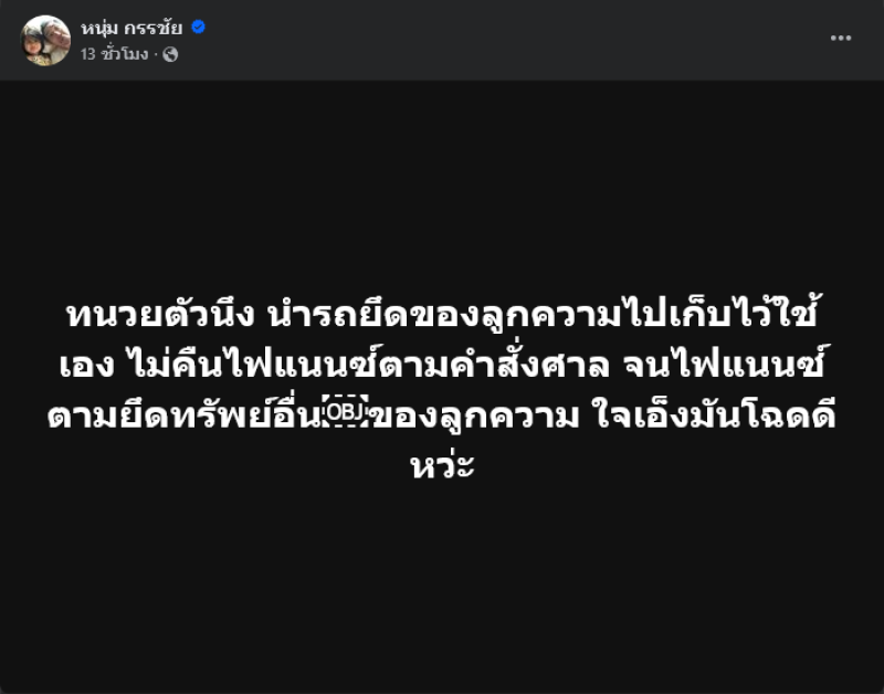 ทั้งนี้ หนุ่ม กรรชัย ได้โพสต์ว่า ทนวยตัวนึง นำรถยึดของลูกความไปเก็บไว้ใช้เอง ไม่คืนไฟแนนซ์ตามคำสั่งศาล จนไฟแนนซ์ตามยึดทรัพย์อื่นของลูกความ ใจเอ็งมันโฉดดีหว่ะ งานนี้ทำเอาชาวเน็ตเข้ามาคอมเมนต์กันอย่างมาก อาทิ หมดกันขอบตาช้านนนน ไม่ต้องได้พัก555,เพราะเรื่องชาวบ้านคืองานของเรา เอ็ม150 1 แพ็คพร้อมครับ,ทนวยคนไหน เปิดวาร์ปให้ที แบบนี้ก็ได้หรอ เป็นต้น