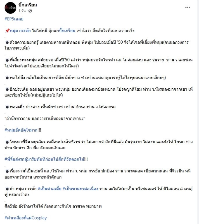 ล่าสุด เพจดังอย่าง “บิ๊กเกรียน” ได้เล่าเรื่องนี้อีกมุม โดยอ้างปากคำคนสนิทของหนุ่ม กรรชัย ตอนไปบวชเมื่อปี 2550 โดยมีรายละเอียดว่า EP5เฉลย หนุ่ม กรรชัย ไม่ได้หนี ตุ๊กแก บิ๊กเกรียน เข้าใจว่าอึดอัดใจที่ตอบความจริง