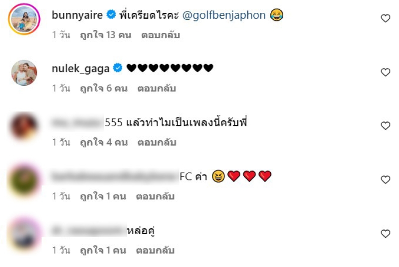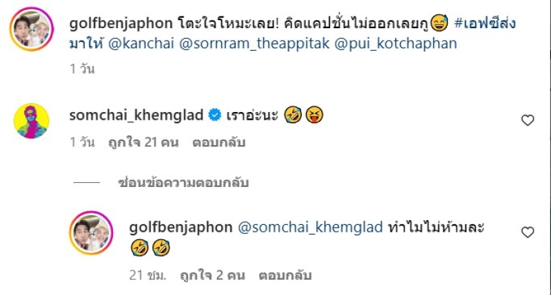 และด้าน เต๋า สมชาย ก็เข้ามาคอมเมนต์ด้วยว่า เราอ่ะนะ อิโมจิขำ ซึ่ง กอล์ฟ ก็เข้ามาคอมเมนต์ตอบด้วยว่า ทำไมไม่ห้ามละ