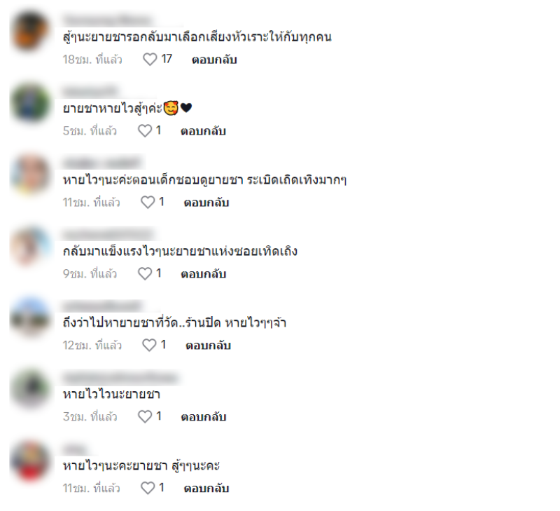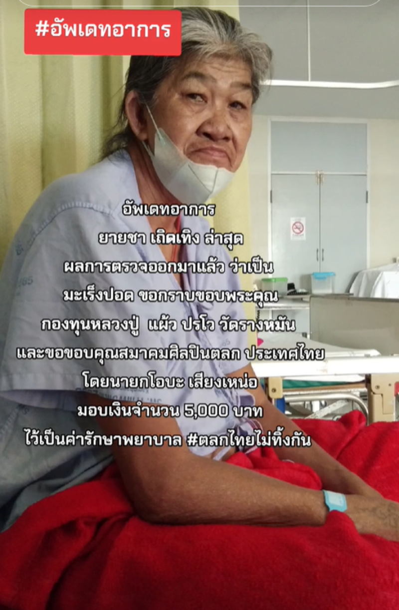 ล่าสุดอัปเดตอาการ ยายชา เถิดเทิง ล่าสุด ผลการตรวจออกมาแล้วว่าเป็นมะเร็งปอด ขอกราบขอบพระคุณกองทุนหลวงปู่ แผ้ว ปรโว วัดรางหมัน และขอขอบคุณสมาคมศิลปินตลกแห่งประเทศไทย โดยนายกโอบะ เสียงเหน่อ มอบเงินจำนวน 5,000 บาท ไว้เป็นค่ารักษาพยาบาล #ตลกไทยไม่ทิ้งกัน" ท่ามกลางแฟนตลกที่เข้ามาคอมเมนต์ให้กำลังใจยายชามากมาย