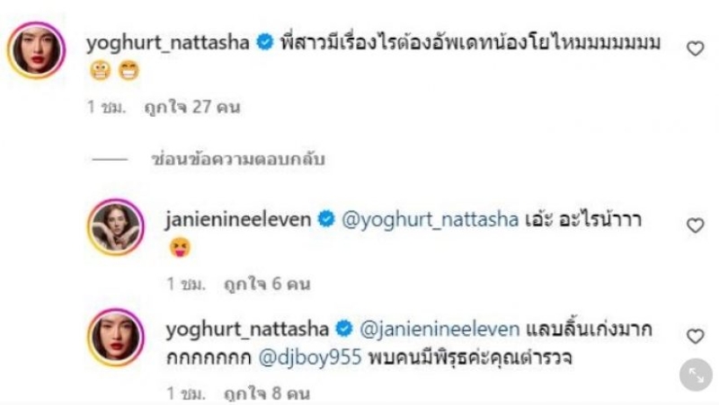 ขณะที่ เจนี่ เปิดเผยว่าพอมันวัยนี้มันไม่เม้าท์มอยแล้ว มันเหมือนกับแบบมองตาก็รู้ใจ เอาจริงๆ โสดหรือไม่โสด แก๊งเรามาตลอดอยู่แล้ว บางทีมันไม่สามารถพูดออกอากาศได้เลย โยเกิร์ตเป็นคนที่เข้มแข็ง แต่ว่ามีความอ่อนไหวง่าย แต่เชื่อว่าทุกสิ่ง ทุกอย่าง โยเกิร์ตสามารถผ่านไปได้ด้วยดี ดีมาก ถึงมากที่สุด แล้วอยากจะบอกว่าพี่คนนี้จะอยู่เป็นกำลังใจให้ อยู่เคียงข้าง ถึงแม้โยจะส่งข้อความมาหาพี่ แล้วพี่ชิ่งตลอดเวลา ไม่ออกบ้าง แต่อยากให้รู้ไว้ว่าพี่อยู่ข้างน้องเสมอ แล้วรักน้องจริงๆ