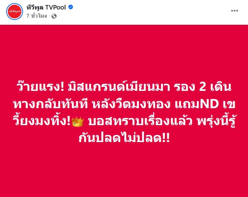 โดยทาง ทีวีพูล ก็ออกมาโพสต์ว่า ว๊ายแรง! มิสแกรนด์เมียนมา รอง 2 เดินทางกลับทันที หลังวืดมงทอง แถมND เขวี้ยงมงทิ้ง! บอสทราบเรื่องแล้ว พรุ่งนี้รู้กันปลดไม่ปลด!!