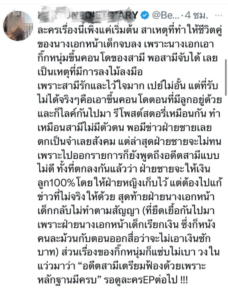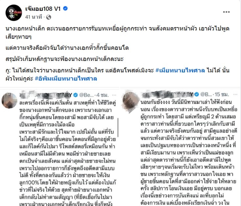 เรืยกได้ว่า เป็นกระเดือดมากๆ เมื่อทางเพจดัง อย่าง เจ๊มอย108 V1 ได้ออกมาเปิดประเด็นว่า นางเอกหน้าเด็ก ตะเวนออกรายการรับบทเหยื่อผู้ถูกกระทำ จนสังคมตราหน้าผัว เอาผัวไปพูดเสียๆหายๆ แต่ความจริงคือผัวจับได้ว่านางเอกหิ้วกิ๊กขึ้นคอนโด สรุปผัวเก็บหลักฐานจะฟ้องนางเอกหน้าเด็กละนะ กู: ไม่ได้สนใจว่านางเอกหน้าเด็กเป็นใคร แต่อิคนโพสต์เมิงจะ #เมียทนายไพศาล ไม่ได้ นั่นผัวใหม่กูค่ะ #อิพิมเมียทนายไพศาส พร้อมทั้งแนบโพสต์ด้วยนั่นเอง
