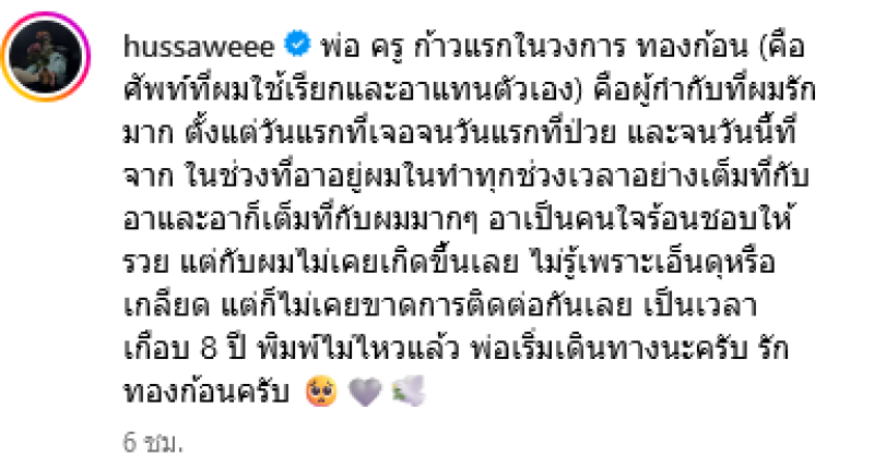 พ่อ ครู ก้าวแรกในวงการ ทองก้อน (คือศัพท์ที่ผมใช้เรียกและอาแทนตัวเอง) คือผู้กำกับที่ผมรักมาก ตั้งแต่วันแรกที่เจอจนวันแรกที่ป่วย และจนวันนี้ที่จาก ในช่วงที่อาอยู่ผมในทำทุกช่วงเวลาอย่างเต็มที่กับอาและอาก็เต็มที่กับผมมากๆ อาเป็นคนใจร้อนชอบให้ รวย แต่กับผมไม่เคยเกิดขึ้นเลย ไม่รู้เพราะเอ็นดุหรือเกลียด แต่ก็ไม่เคยขาดการติดต่อกันเลย เป็นเวลาเกือบ 8 ปี พิมพ์ไม่ไหวแล้ว พ่อเริ่มเดินทางนะครับ รัก ทองก้อนครับ