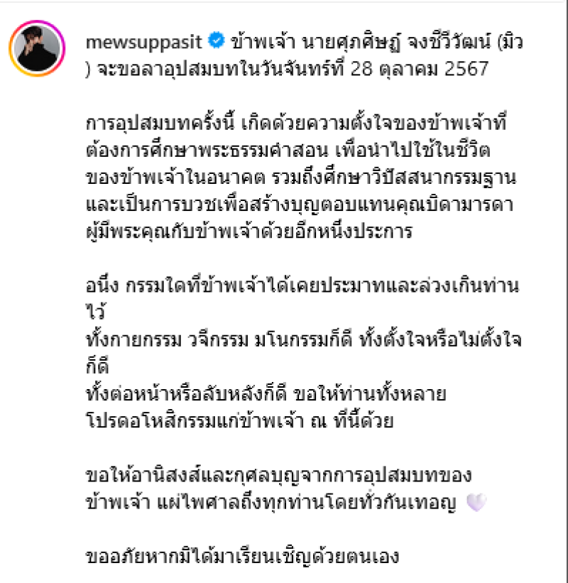 ข้าพเจ้า นายศุภศิษฏ์ จงชีวีวัฒน์ (มิว) จะขอลาอุปสมบทในวันจันทร์ที่ 28 ตุลาคม 2567 การอุปสมบทครั้งนี้ เกิดด้วยความตั้งใจของข้าพเจ้าที่ต้องการศึกษาพระธรรมคำสอน เพื่อนำไปใช้ในชีวิตของข้าพเจ้าในอนาคต รวมถึงศึกษาวิปัสสนากรรมฐาน และเป็นการบวชเพื่อสร้างบุญตอบแทนคุณบิดามารดา ผู้มีพระคุณกับข้าพเจ้าด้วยอีกหนึ่งประการ