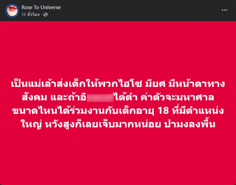เรียกได้ว่าเป็นข่าวเมาท์แรงสนั่นวงการนางงามมากเมื่อเพจดัง Rose To Universe ได้ออกมาโพสต์เปิดประเด็นแฉ ND นางงาม พร้อมระบุข้อความว่า เป็นแม่เล้าส่งเด็กให้พวกไฮโซ มียศ มีหน้าตาทางสังคม และถ้าอิxxได้ตำ ค่าตัวจะมหาศาลขนาดไหนได้ร่วมงานกับเด็กอายุ 18 ที่มีตำแหน่งใหญ่ หวังสูงก็เลยเจ็บมากหน่อย ปามงลงพื้น