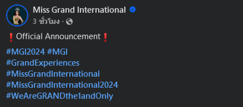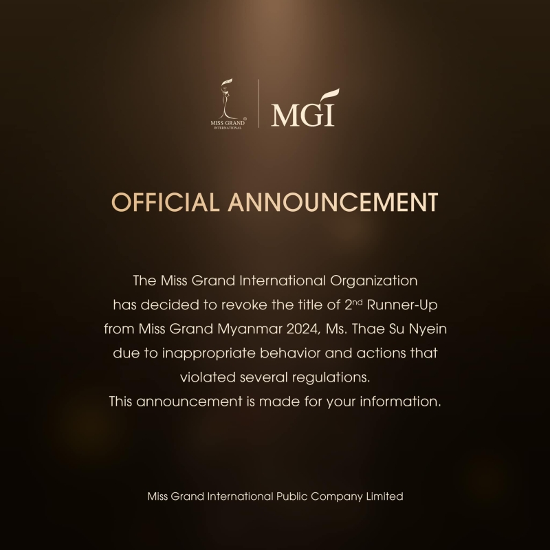 The Miss Grand International Organization has decided to revoke the title of 2nd Runner-Up from Miss Grand Myanmar 2024, Ms. Thae Su Nyein due to inappropriate behavior and actions that violated several regulations. This announcement is made for your information องค์การมิสแกรนด์อินเตอร์เนชั่นแนลมีมติเพิกถอนตำแหน่งรองอันดับ 2 มิสแกรนด์เมียนมา 2024 แธ ซู เญียน เนื่องจากพฤติกรรมไม่เหมาะสม และมีการกระทำฝ่าฝืนกฎระเบียบหลายประการ ประกาศนี้จัดทำขึ้นเพื่อแจ้งให้ทราบ