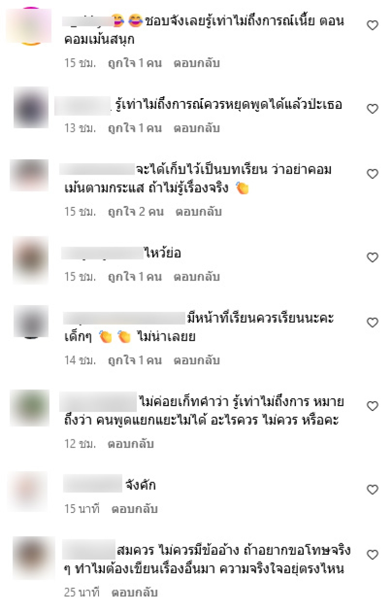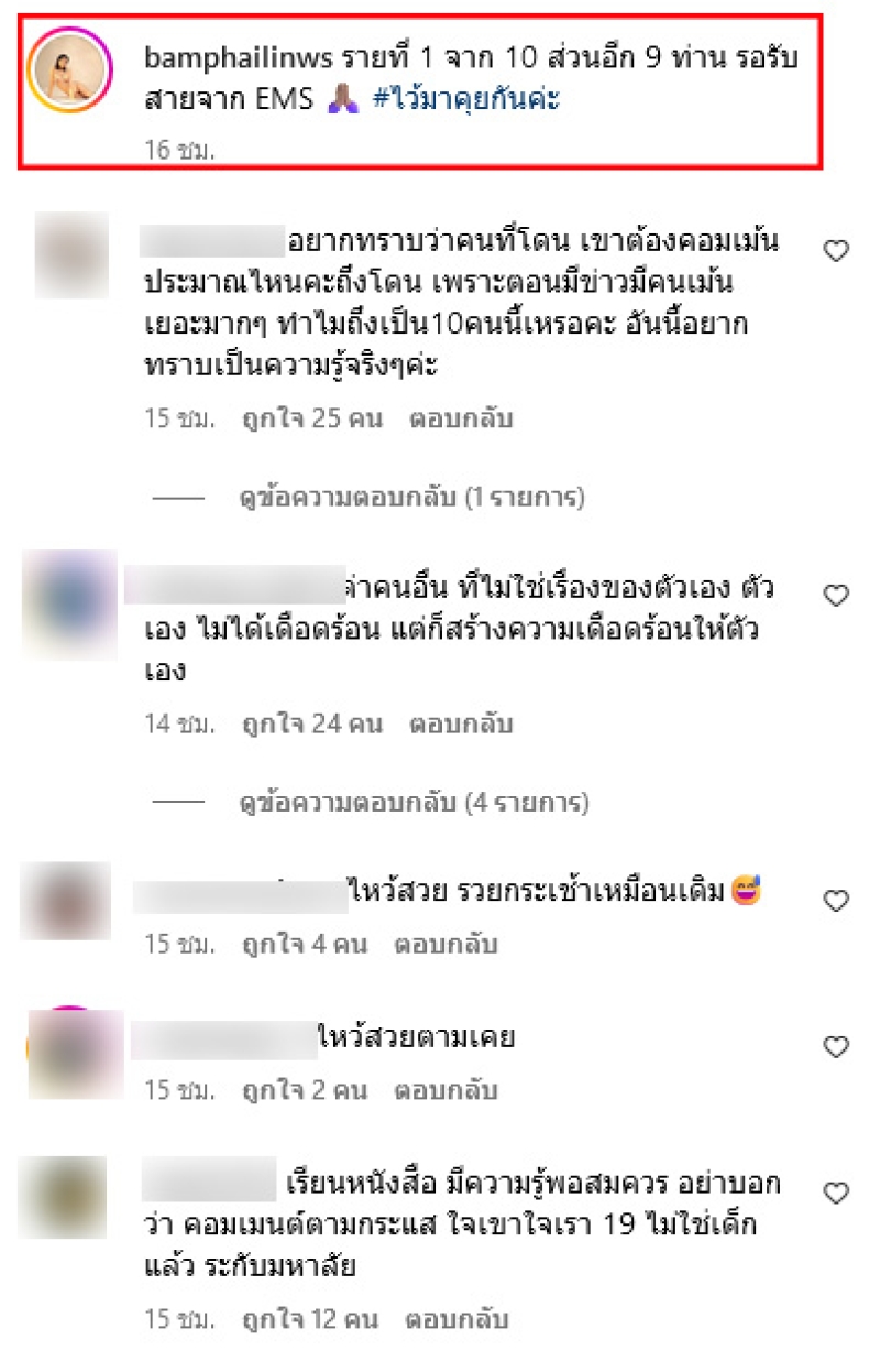 ทั้งนี้ แบม ยืนยันว่าเธอไม่ได้แย่งชิงหรือเป็นน้อยใคร พร้อมชี้แจงว่าผู้ที่วิจารณ์เธอโดยไม่รู้ข้อเท็จจริงจะต้องเผชิญกับผลทางกฎหมาย ล่าสุด เเบม ได้ออกมาโพสต์เเชทข้อความที่คู่กรณีทักมาขอโทษที่เรื่องที่คอมเมนต์ไม่ดี โดยได้เขียนแคปชั่นว่า รายที่ 1 จาก 10 ส่วนอีก 9 ท่าน รอรับสายจาก EMS #ไว้มาคุยกันค่ะ
