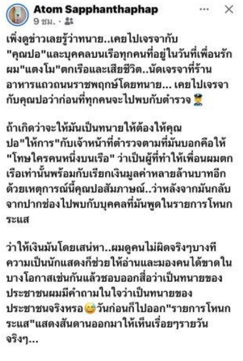 เพิ่งดูข่าวเลยรู้ว่าทนาย..เคยไปเจรจากับ คุณปอ และบุคคลบนเรือทุกคนที่อยู่ในวันที่เพื่อนรักผม แตงโม ตกเรือและเสียชีวิต นัดเจรจาที่ร้านอาหารแถวถนนราชพฤกษ์โดยทนาย... เคยไปเจรจากับคุณปอว่าก่อนที่ทุกคนจะไปพบกับตำรวจ ถ้าเกิดว่าจะให้มันเป็นทนายให้ต้องให้คุณปอ ให้การ กับเจ้าหน้าที่ตำรวจตามที่มันบอกคือให้ โทษใครคนหนึ่งบนเรือ ว่าเป็นผู้ที่ทำให้เพื่อนผมตกเรือเท่านั้น