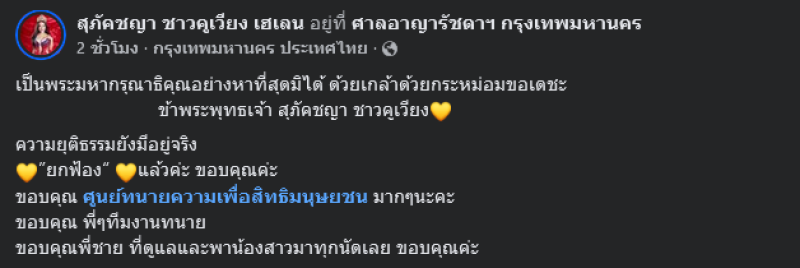 ล่าสุด หนูรัตน์ ได้โพสต์เฟสบุ๊ก ระบุข้อความว่า เป็นพระมหากรุณาธิคุณอย่างหาที่สุดมิได้ ด้วยเกล้าด้วยกระหม่อมขอเดชะ ข้าพระพุทธเจ้า สุภัคชญา ชาวคูเวียง ความยุติธรรมยังมีอยู่จริง ยกฟ้อง แล้วค่ะ ขอบคุณค่ะ ขอบคุณ ศูนย์ทนายความเพื่อสิทธิมนุษยชน มากๆนะคะ ขอบคุณ พี่ๆทีมงานทนาย ขอบคุณพี่ชาย ที่ดูแลและพาน้องสาวมาทุกนัดเลย ขอบคุณค่ะ